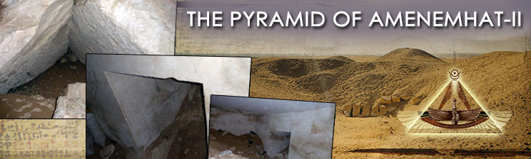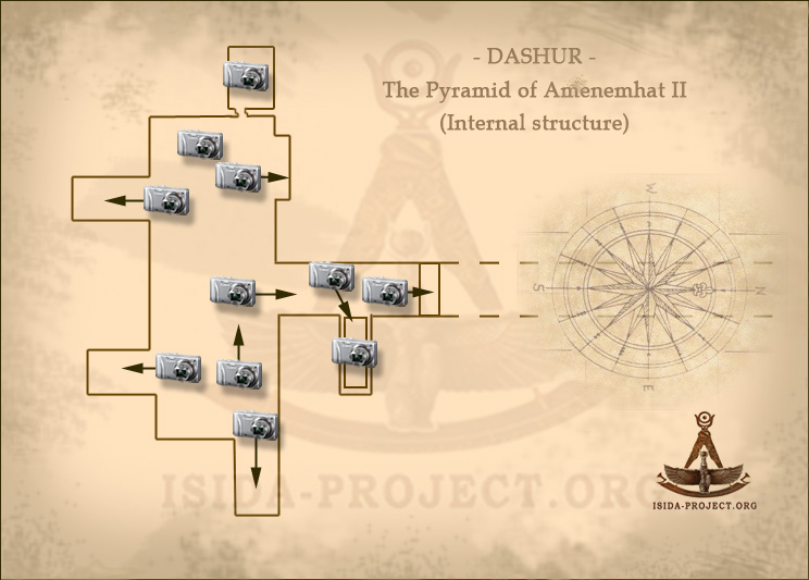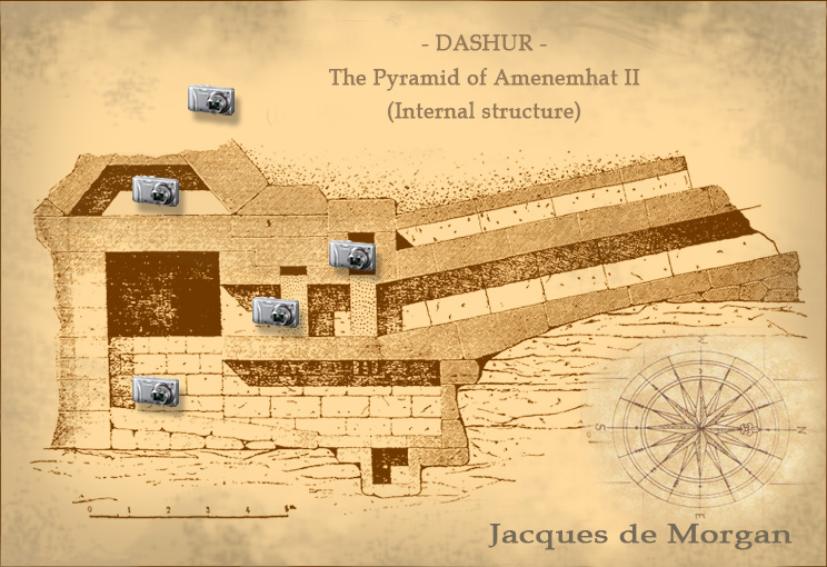 One and a half kilometers to the east of the Red Pyramid of Sneferu, one can see the ruins of the White Pyramid of Amenemhat II, a Pharaoh of the XII Dynasty, son of Sesostris I. Only a part of it's interior rooms have survived from the once majestic structure, and can be accessed through an opening that appeared as a result of the collapse of one of the blocks of the vault of the Releaving Chamber. The original height of the Pyramid and the length of the side of its basewas not determined and still remains unknown. According to the materials of the first researchers, the Pyramid was built of white limestone, which subsequently gave it its second name - "The White Pyramid". In the period from 1894 to 1895, the French archaeologist Jacques de Morgan, who headed the Egyptian Department of Antiquities, established by Auguste Mariette, has conducted the large-scale excavations in the area of the Pyramid of Amenemhat II. The result of his work is available here: ("Fouilles a Dahchour: Mars - Juin 1894"). Below is a diagram of the location of the Pyramid of Amenemhat II, drawn by Jacques de Morgan.