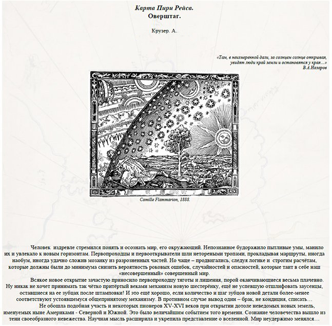 …Скитания под парусом судьбы. Иногда избранному курсу не благоволит попутный ветер. Иногда попутный ветер ни на кабельтов не приближает к цели. Иногда, чтоб приблизиться к цели, необходимо обогнуть рифы. И тогда приходится идти против ветра и воли волн. Но самым важным элементом такого путешествия является карта. И чем она точнее составлена, тем выше вероятность однажды бросить якорь в порту назначения. Иначе – все так и останется несбыточной мечтой. Прав ли Чарльз Хэпгуд в своих выводах? Верна ли интерпретация карты Пири Рейса? Владел ли Пири Рейс некой картой, являющейся наследием древнейших цивилизаций, либо пришельцев с далёких звезд? Небольшое исследование призвано ответить на эти и некоторые сопутствующие вопросы, связанные с происхождением знаменитой карты.